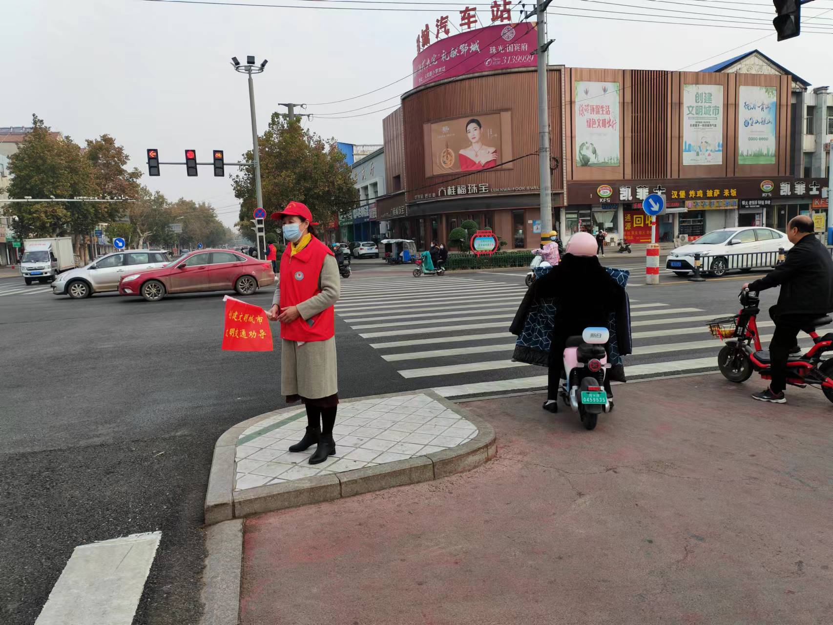 郓城县尚德志愿者协会带领初高中学生志愿者走向街头十字路口引导群主遵守交通规则,记得带好头盔等志愿服务。